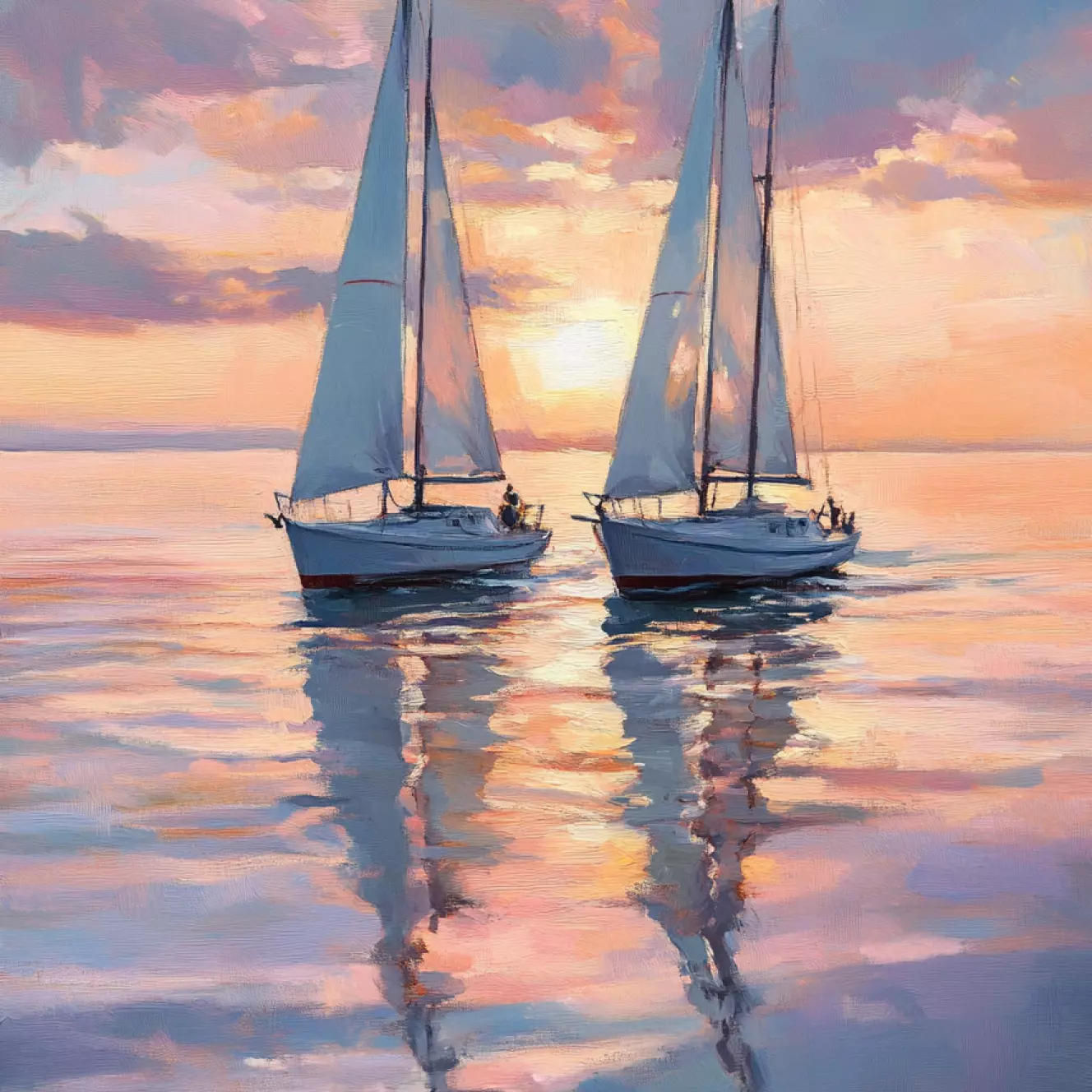 «Путешествие к закату» — это история о спокойствии и мечтах, рассказанная через два кораблика, плывущих по тихому морю в нежном сиянии уходящего дня. Картина передаёт тёплую гармонию природы, когда закат окутывает всё вокруг мягкими оттенками золота и розового, создавая ощущение завершённости и надежды. 🌊✨